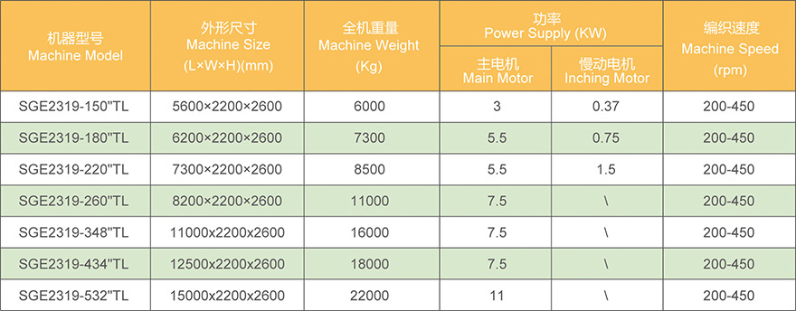 產品簡介:用于編織各種無結漁網、安全防護網、圍網、橄欖網、遮陽網等。采用開式凸輪傳動機構,三輥羅拉積極送經。主要技術參數1、針型:舌針或嵌舌針2、機號:E1、E2、E6、E9、E12、E143、梳櫛數:2-5把4、工作門幅:150" (3810mm),180" (4572mm),…