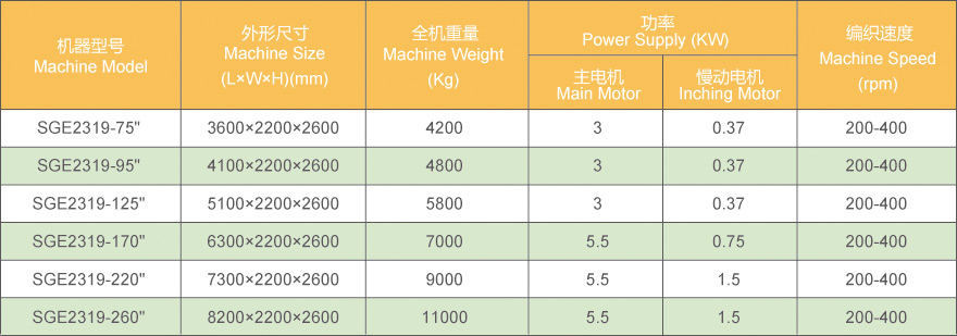 采用油浸式偏心連桿機構,三輥羅拉積極送經,單絲片狀紗架或阻尼式園絲紗架。
