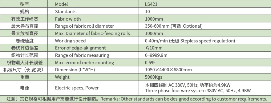 LS421-10型特寬幅四折驗卷機主要用于遮陽網廠,以及各塑料制品廠的后整理車間,可對各種網布織物成品,進行檢驗、修正、6米至10米幅寬的織物進行四折分卷,1米至2.5米的織物進行平幅檢驗分卷,保證實現理想的包裝運輸及出廠。